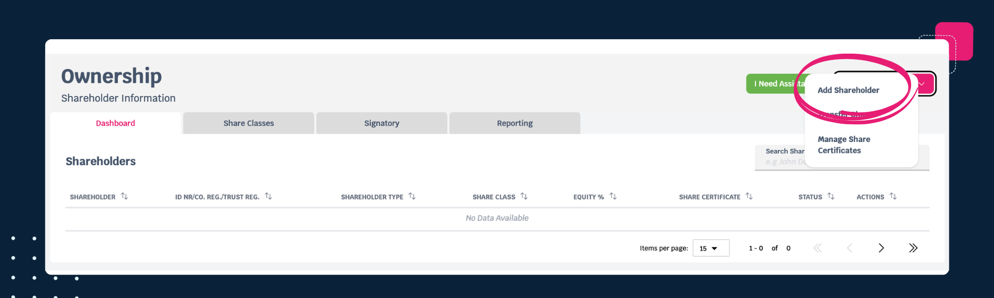 The platform is now ready for you to add new shareholder/s to the Company Profile. Simply toggle the "Manage Ownership" button in the top right corner to access the "Add Shareholder" button.