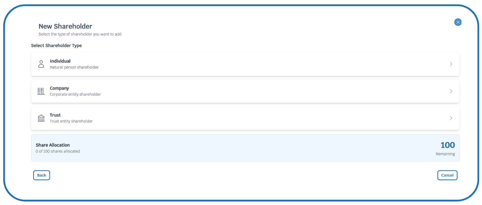 Depending on the type of shareholder you are adding, follow one of the below "entity-specific" workflows to complete the task: